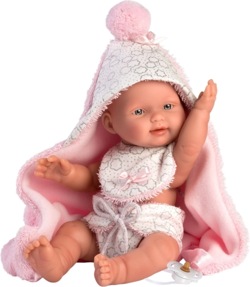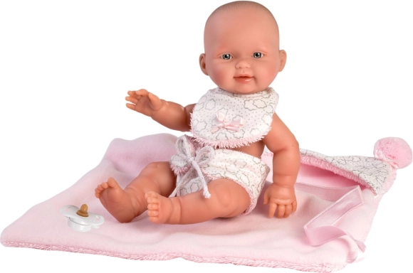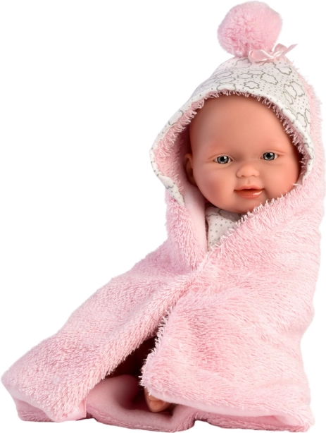 Този двуделен комплект е проектиран специално за кукла бебе New Born с размер 26 см. Съдържа двустранно одеялце с качулка, което предпазва куклата и ѝ придава вид на истинско бебе.