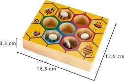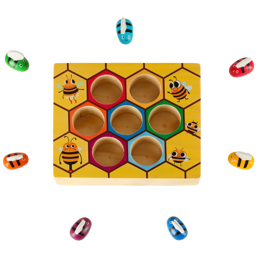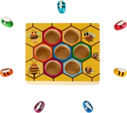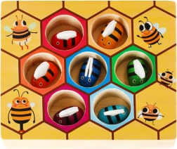 Образователна игра Пчелна пита Монтесори подпомага развитието на моторни умения и самостоятелност у децата. Съдържа основа от масивно дърво и седем цветни пчелички, които децата поставят в съответните отвори с помощта на включената червена пластмасова пинсета.