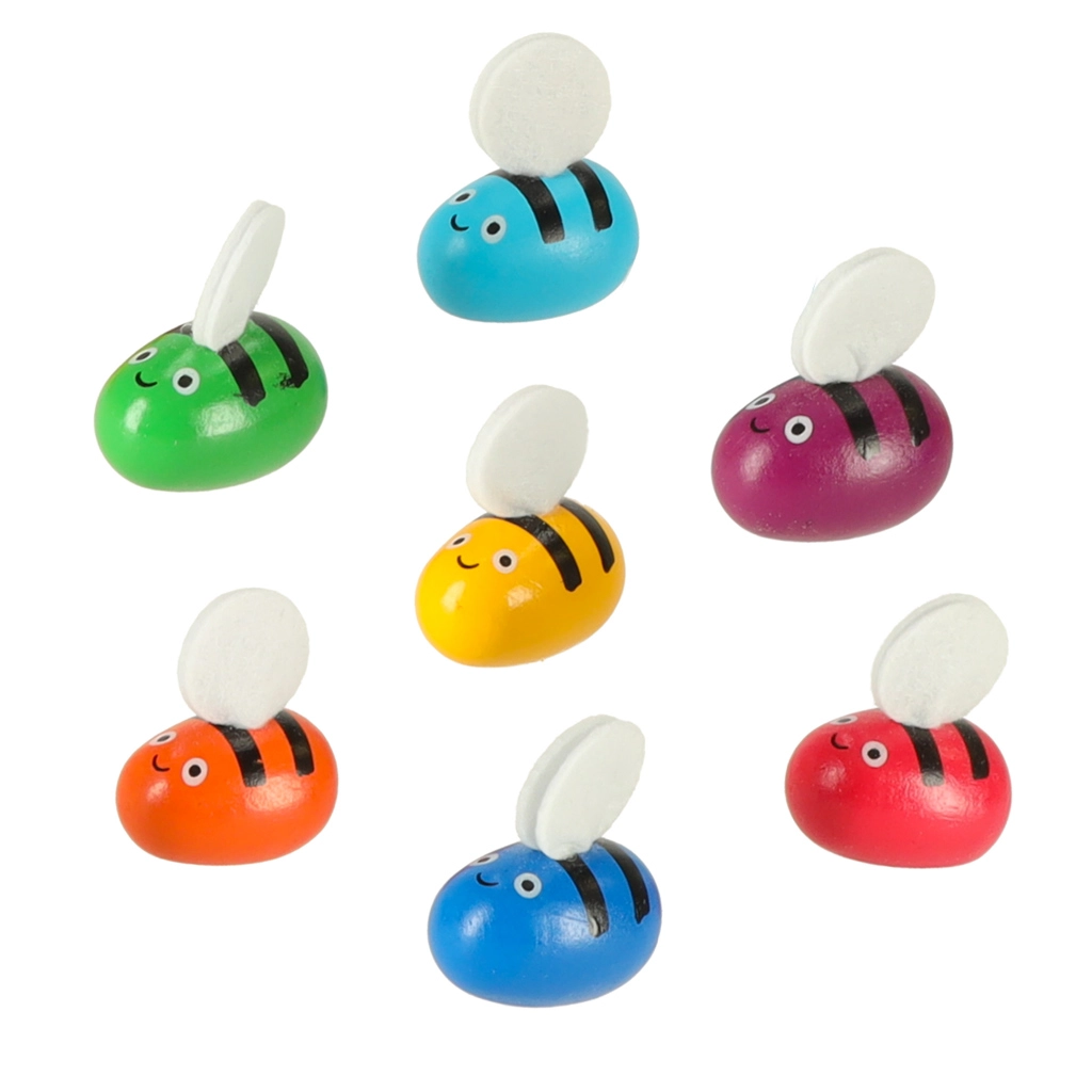 Играта подпомага развитието на фината моторика и координацията око-ръка по време на забавление с цветните пчелички.