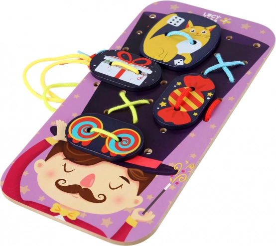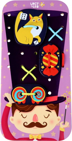 Този забавен комплект за нанизване и промушване с мотив вълшебник кани децата в света на фантазията. На голямата подложка с глава на вълшебник и неговата шапка те могат с помощта на връзките да прикрепят цветни аксесоари – от зайче и монети до тайнствени карти. По време на играта децата тренират координацията око–ръка, търпението и творческото мислене.