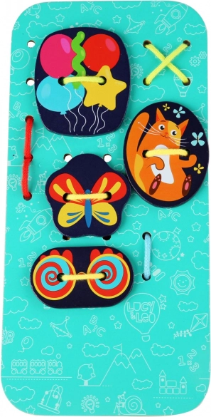 Открийте креативния дървен нанизващ комплект Lucy & Leo, който подпомага фината моторика, креативността и различаването на цветове и форми. Комплектът съдържа 31 дървени елемента, 4 цветни връзки и голяма подложка с вълшебник, върху която децата промушват и прикрепят украшения според въображението си.