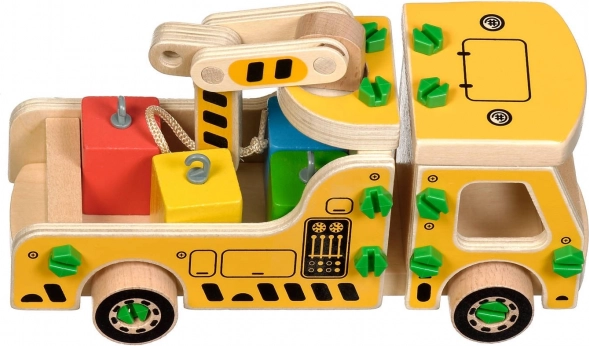 Комплектът съдържа 16 дървени части за сглобяване на кран, винтове, отвертка и 4 цветни блокчета, представляващи товар. Играчката също така служи като помощник по Монтесори, който помага на детето ефективно да развива разнообразни умения.