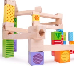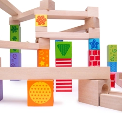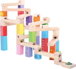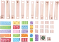 Тази дървена писта за топчета е идеална за креативни деца, които обичат да строят свои собствени трасета. Комплектът включва 53 части, които позволяват множество вариации и дизайни, вдъхновени от детското въображение.