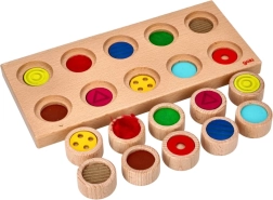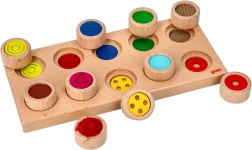 Тази висококачествена дървена сензорна игра съчетава забавление и учене. Десет миницилиндъра с различни повърхности децата обръщат с лицето надолу, разбъркват и само чрез допир установяват къде точно принадлежи всеки. Чудесно средство за развитие на сензомоториката, концентрацията и търпението, подходящо и за хора със зрителни увреждания.