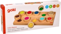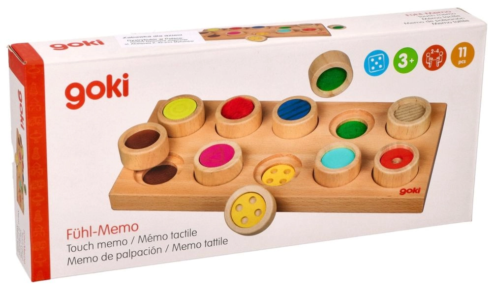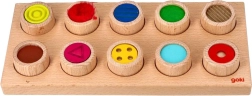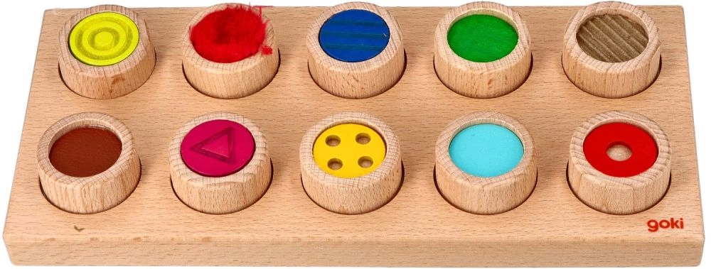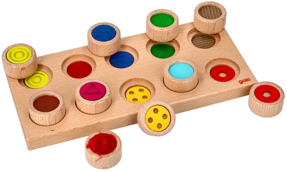 Открийте сензорното забавление с дървената игра GOKI, която развива фината моторика, осезателното възприятие и разпознаването на повърхности и цветове. Децата чрез допир търсят правилния отвор за всеки цилиндър с различна текстура – без да гледат, игриво и безопасно.