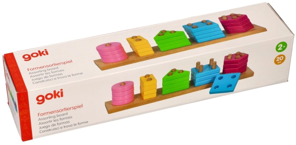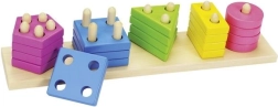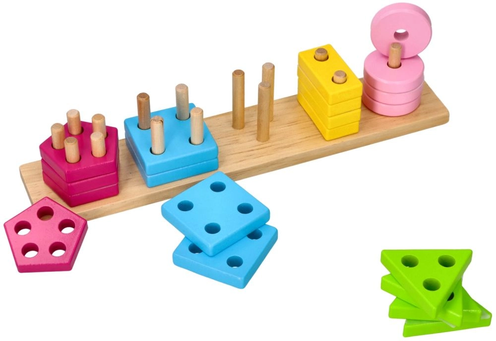 Комплектът включва здрава основна дъска и 20 цветни елемента в пет форми. Качествената изработка от масивна дървесина и безвредните бои осигуряват дълъг живот и безопасна игра. Идеален за деца от 2 години – за дома и детските градини.