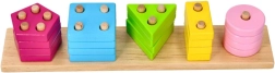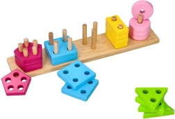Забавна дървена пъзел игра, която комбинира сортиране на цветове и форми с нанизване върху колчета с различен брой отвори. Развива фината моторика, координацията око–ръка и логическото мислене, изработена от масивна дървесина за безопасна и издръжлива игра.