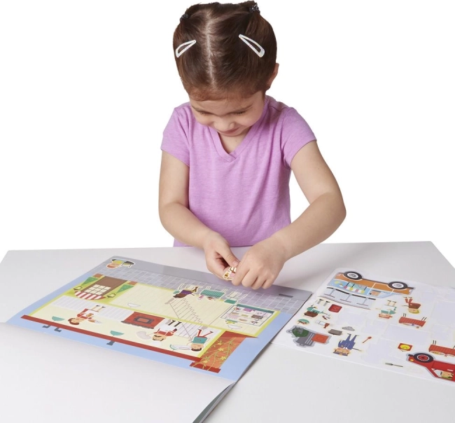 Всеки комплект съдържа многократно използваеми стикери, които лесно могат да се преместват и залепват отново, което позволява на децата да създават безкрайни вариации на сцени.
