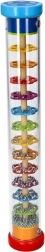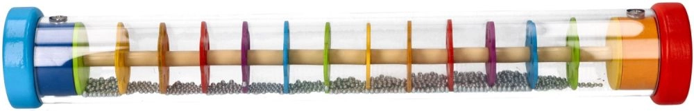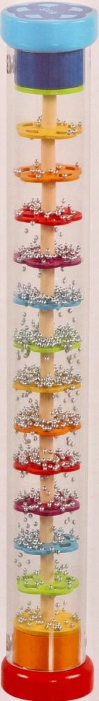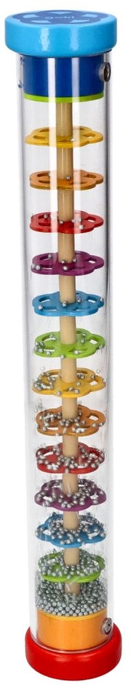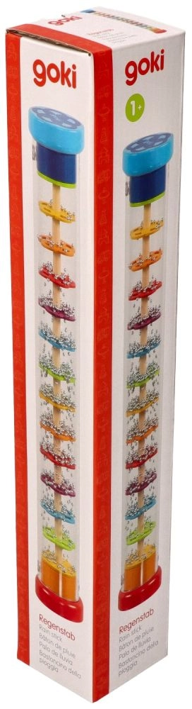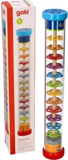 Дъждовната пръчка GOKI е красиво изработена сензорна играчка, която при завъртане на прозрачния тубус имитира звука на падащ дъжд. Топчетата се пресипват през слоеве от цветни цветя и създават успокояващи, естествени звуци, които очароват децата и подпомагат тяхната концентрация.