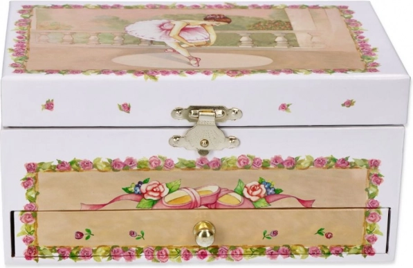Елегантна музикална кутия за бижута с чекмедженце и сладка балерина ще зарадва всяка малка кокетка. При отваряне зазвучава мелодията „Лебедово езеро“, а балерината се завърта пред огледалцето. Кутията предлага практично място за съхранение за дреболии и бижута и е красив декоративен аксесоар за детската стая.
