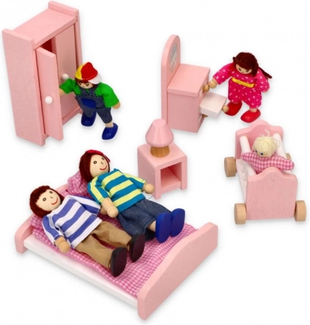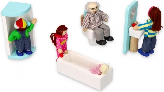 Открийте чара на креативната игра с това дървено семейство за къща за кукли. Комплектът включва родители, деца и бебе, всички с текстилно облекло и огъваеми крайници за лесно позициониране. Перфектен за ролеви игри, развитие на въображението, фината моторика и социалните умения на деца от 3 години.