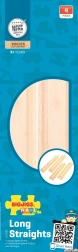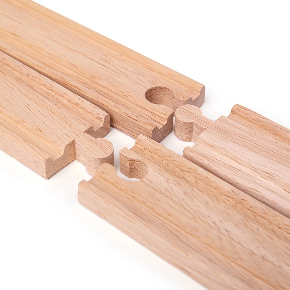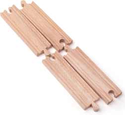 Разширете дървената си влакова линия с 4 бр. качествени прави релси с дължина 21 см. Изработени от висококачествена твърда дървесина, напълно съвместими с повечето дървени влакови системи и отговарящи на европейските стандарти за безопасност. Отлични за развитие на въображението, сръчността и координацията при деца от 3 години.