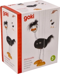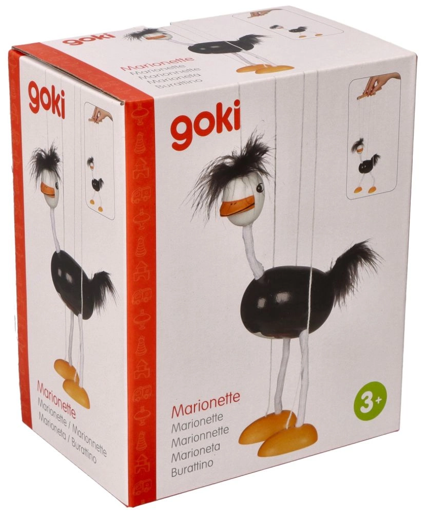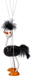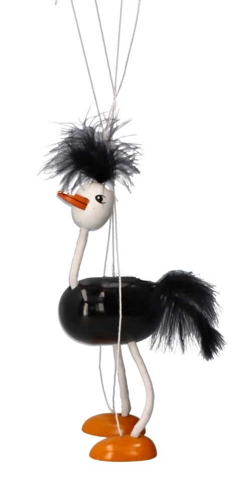 Марионетката има черно тяло, бели крака и глава с ярко оранжеви стъпала. Нежните и меки детайли на главата и опашката допринасят за игривия ѝ вид. Децата ще обикнат как този щраус се движи и колко лесно се управлява.