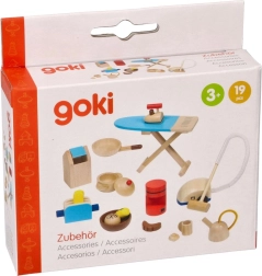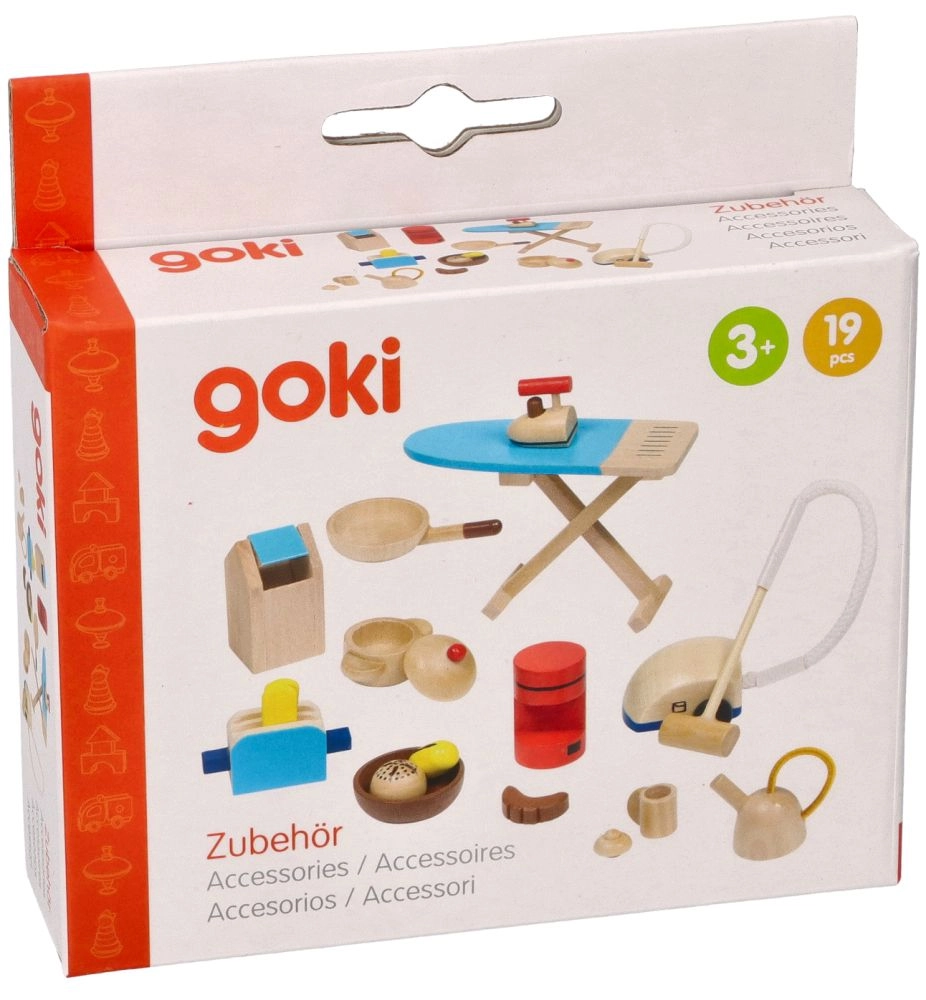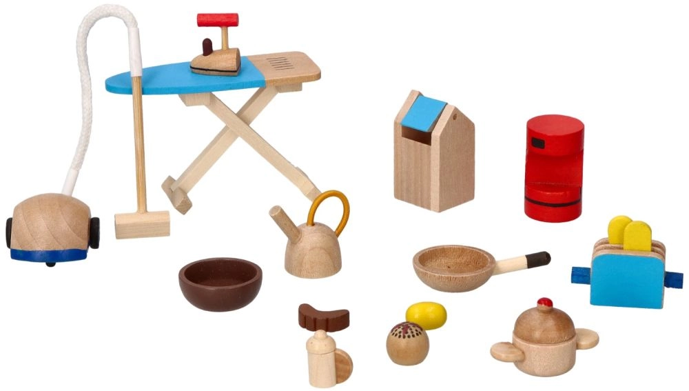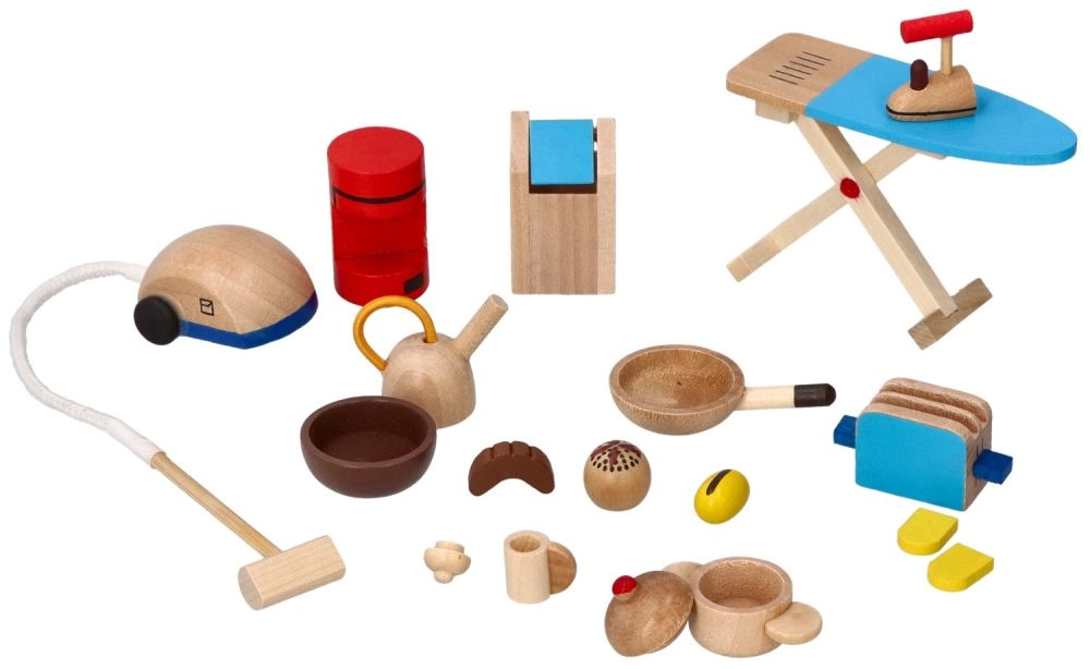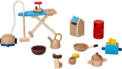 С този прекрасен комплект от 19 дървени играчки децата ще се забавляват с часове в домашна обстановка. Комплектът включва различни домакински уреди, които подпомагат детското развитие и опознаването на света около нас. В опаковката ще откриете играчки като кафемашина, чайник, прахосмукачка, дъска за гладене и много други. Всеки елемент е прецизно изработен с внимание към безопасността и естетиката.