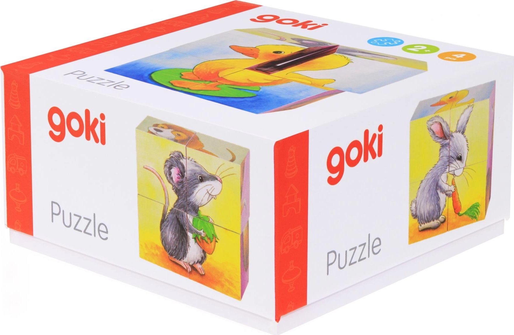 Традиционните картинни кубчета на Goki носят на децата радост от подреждането и откриването. Завъртете всяко кубче в правилната посока и създайте един от шестте мотива с бебета – котенце, мече, кученце, зайче, патенце или мишле. Включени са и примерни картинки, които помагат на децата при подреждането.
