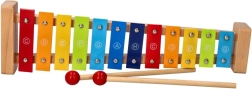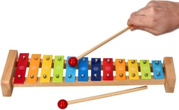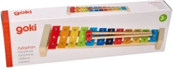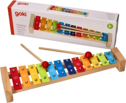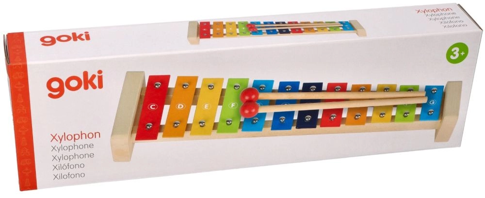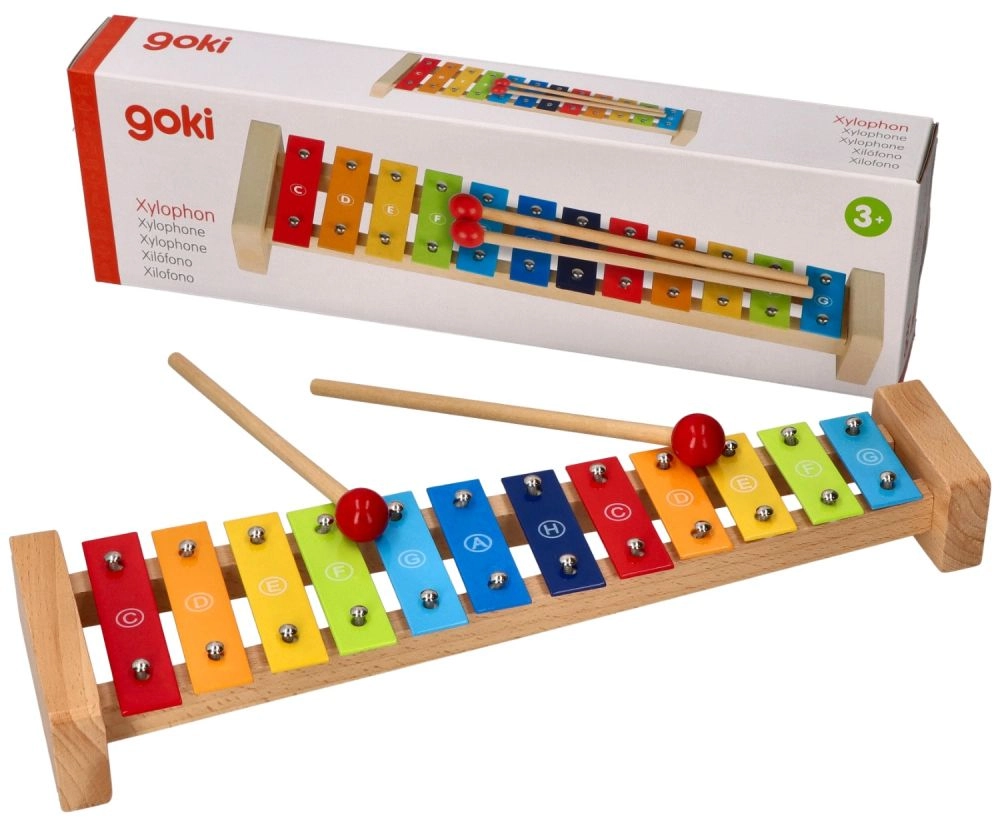 Цветният ксилофон Goki със сборник Пъстра дъга е чудесен избор за първи допир с музиката. Здравата дървена конструкция в комбинация с метални клавиши осигурява приятен звук и дълъг живот. Благодарение на обозначенията на нотите върху клавишите и цветното водене в сборника децата лесно разбират връзката между цветовете, тоновете и простите мелодии.