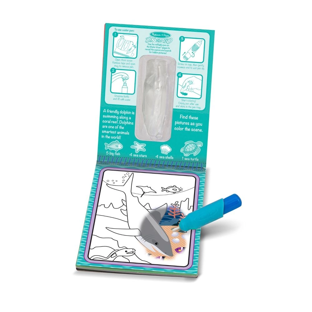 В комплекта ще намерите спирално подвързана книжка с четири цветни изображения и приложени задачи на гърба на всяка страница. Тези задачи включват откриване на определени морски обитатели, което превръща всяко рисуване в страхотно приключение.