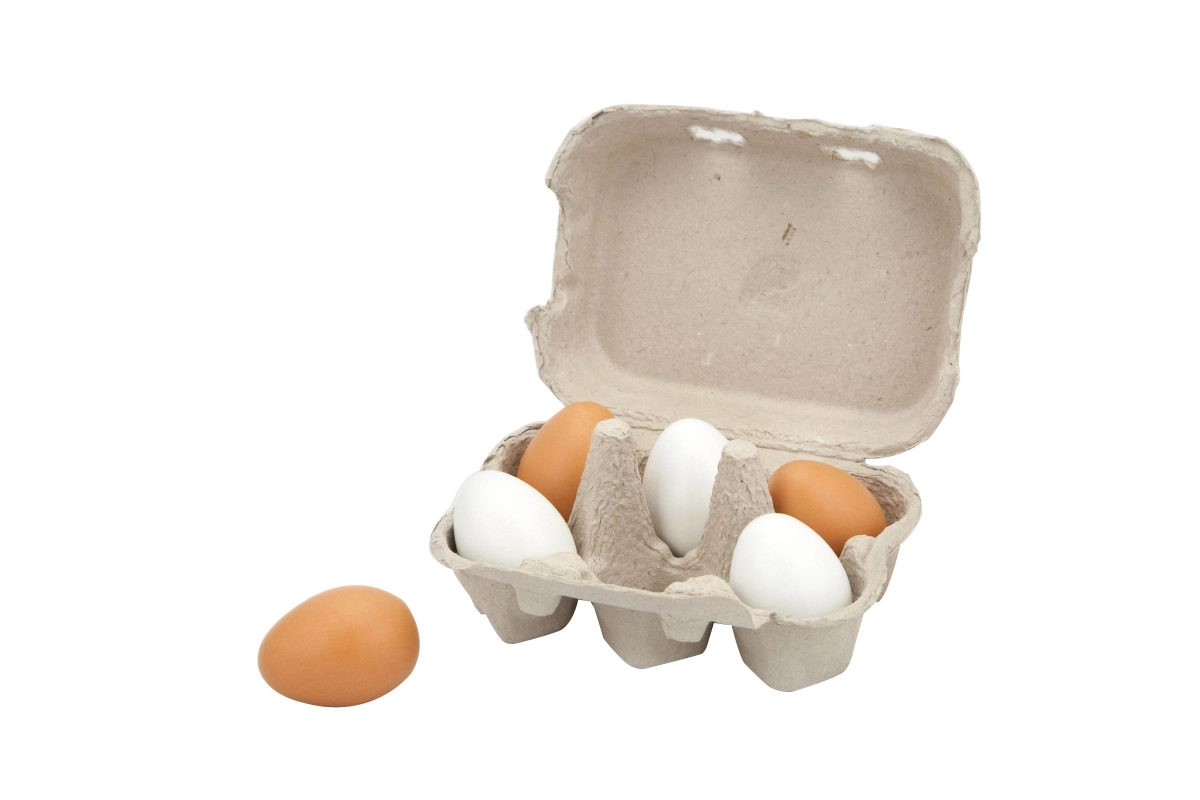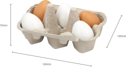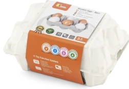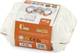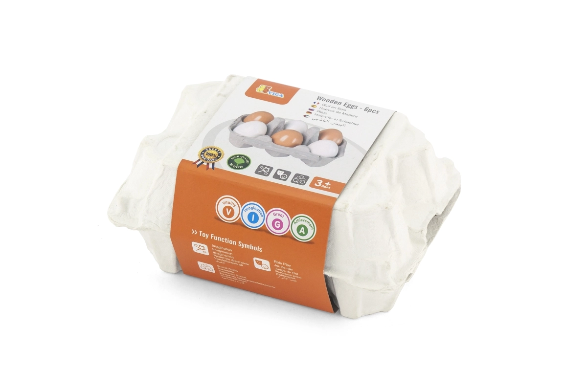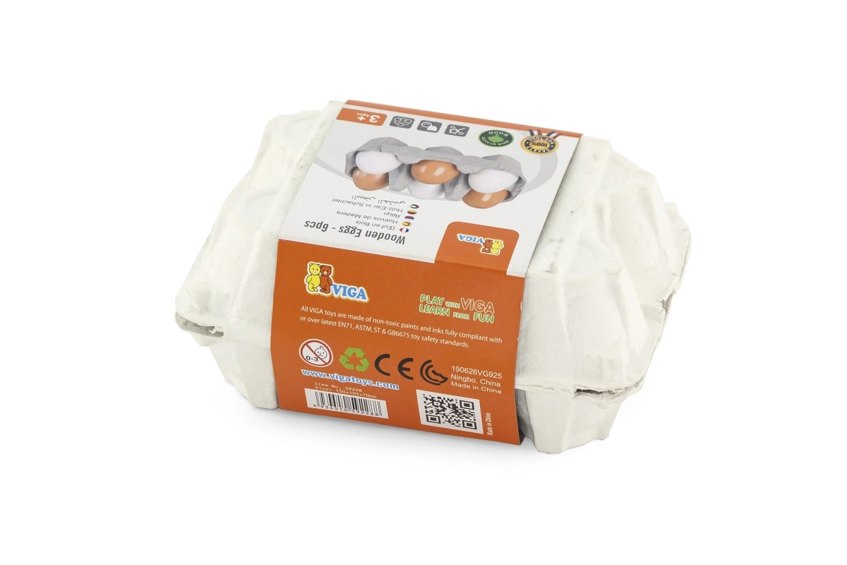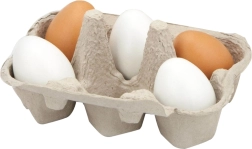 Комплектът съдържа 6 дървени яйца в практична картонена кутийка, която достоверно наподобява истинска опаковка. Децата могат да имитират възрастните при готвене, да „пазаруват“ в детски магазин или да сервират ястия в кухничката. Издръжливият материал и гладката лакирана повърхност са приятни на допир и лесни за поддръжка.