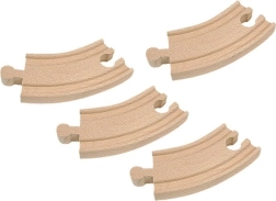 Този комплект от 4 къси извити релси е чудесно допълнение към всяка дървена влакова система. Благодарение на дължината 10 см на елемент лесно създавате компактни дъги, връзки и нови форми на трасето. Релсите се свързват интуитивно и са подходящи за малки строители от 3 години.