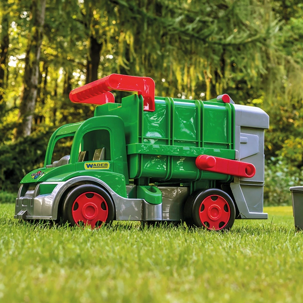Сметосъбиращият камион WADER GIGANT FARMER предлага на децата реалистична игра по почистване на града. Благодарение на подвижния повдигач лесно се изпразва включеният контейнер, отварящата се задна клапа улеснява товаренето и разтоварването, а свободно въртящите се колела осигуряват плавно движение. Товароносимост до 50 кг позволява на децата да седнат върху камиона и да се държат за практичната горна дръжка, докато предната кука позволява теглене или свързване с друго превозно средство или въже.