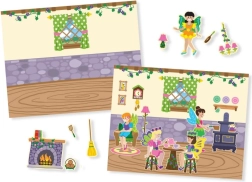 Комплектът включва пъстри илюстрации на феи и вълшебни пейзажи, които подтикват децата да създават свои собствени сцени и истории.