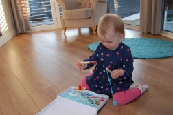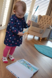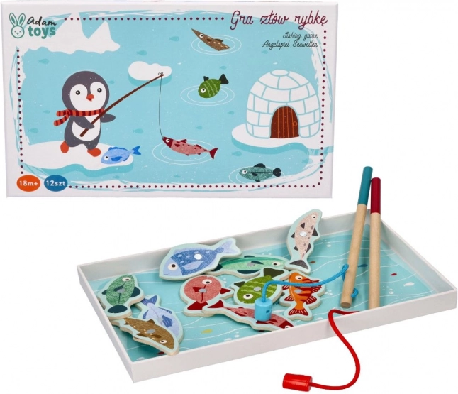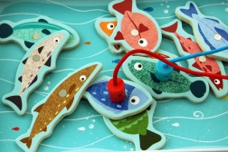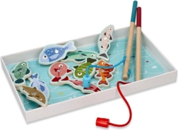 По време на игра детето използва дървена въдица с магнит, което подпомага развитието на координацията око-ръка и фината моторика.