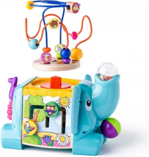 Интерактивният слон в живи цветове е създаден да мотивира децата да изследват. Коралковият лабиринт, въртящите колелца, плъзгащите елементи и зъбните колела предлагат много начини за трениране на пръстите, захвата и логическото мислене. Играчката е стабилна, лесна за хващане и приканва към многократна игра.