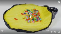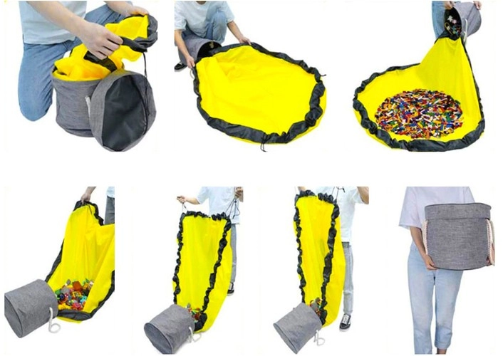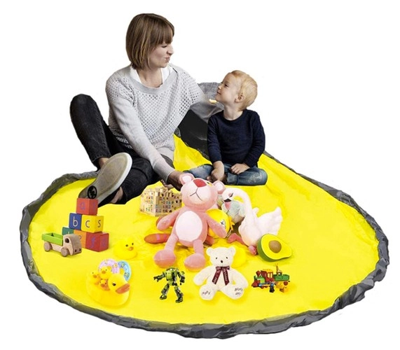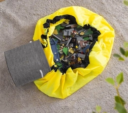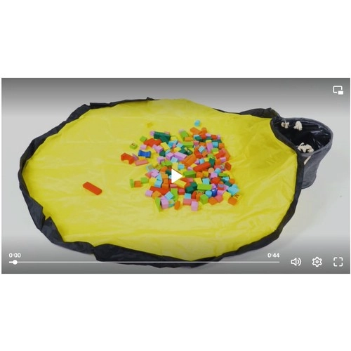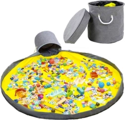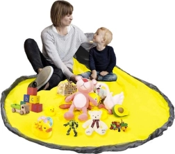 Разстелете голямата подложка (Ø 135 см), оставете децата да играят и след края дръпнете въженцето със стопер – играчките мигновено се прибират в коша.