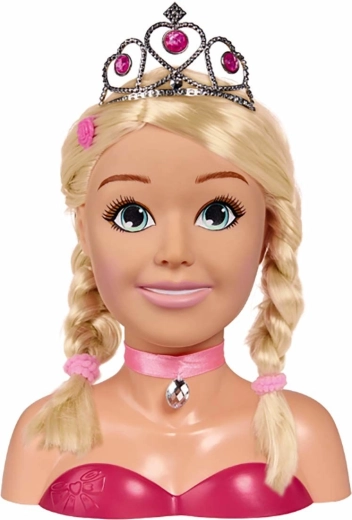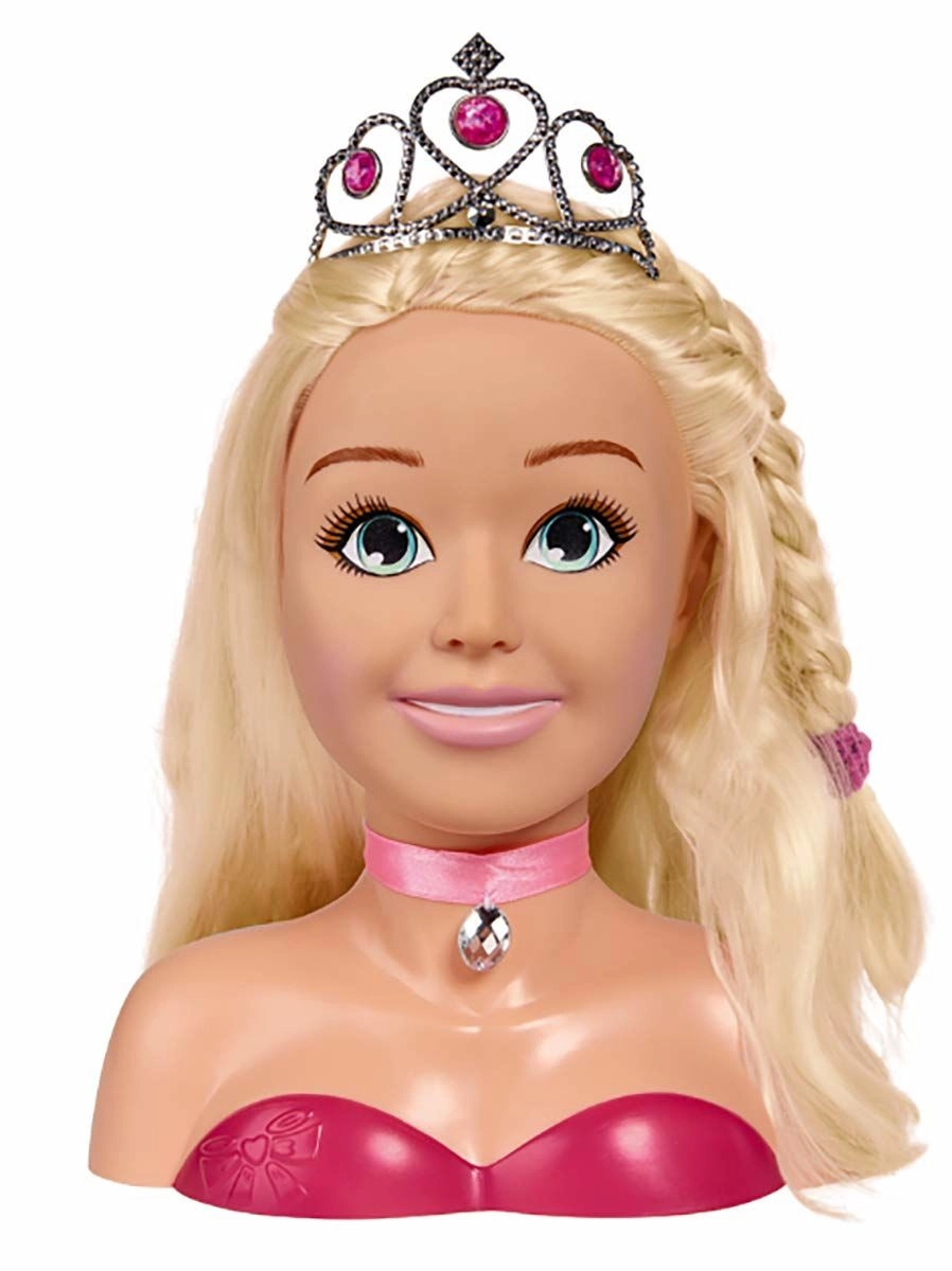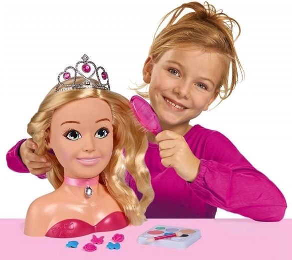 Тази очарователна глава за стилизиране с дълга руса коса и розова панделка с камъче е идеална за малки фризьорки и гримьорки. Благодарение на комплекта аксесоари – от сребърна корона, четка, фиби и ластici до палитра с гримове – децата лесно ще създават приказни прически и нежен макияж.