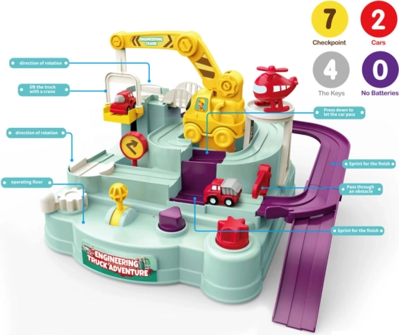 Това препятствено трасе превръща всяко пътуване в малко приключение. По маршрута има редица препятствия, които децата преодоляват благодарение на умното управление с колелца и лостчета. Всеки успех мотивира за нови опити и носи много радост и здравословен състезателен дух.