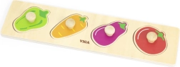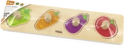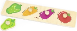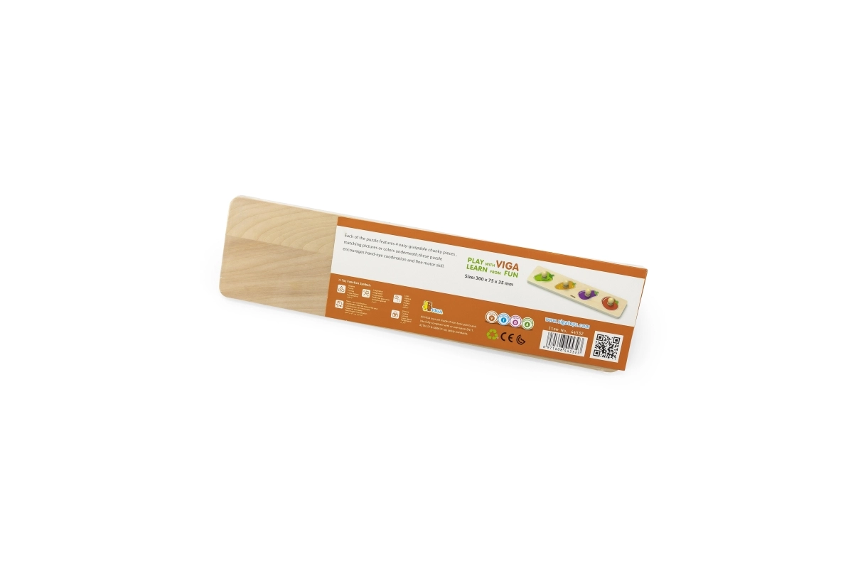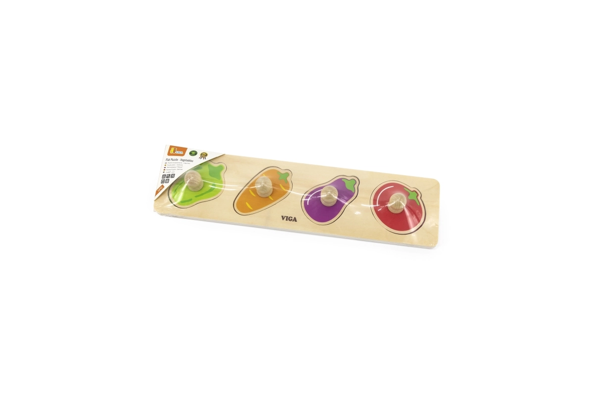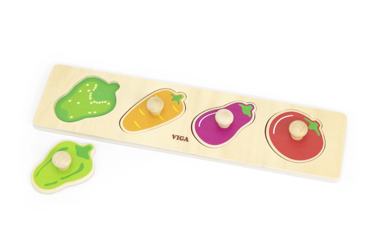 Този качествен дървен пъзел със зеленчукови форми (чушка, морков, патладжан, домат) е идеалният първи пъзел за деца от 1 година. Големите части с дръжки подпомагат правилния захват, тренират координацията око–ръка и помагат на децата да различават цветовете и формите.