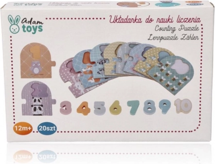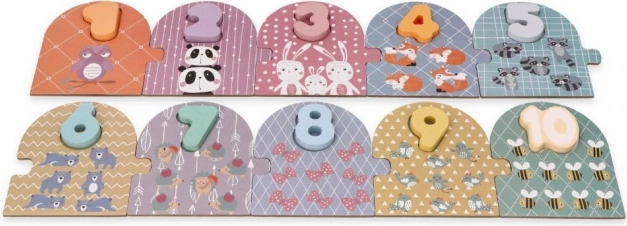 Тази висококачествена дървена игра за подреждане съчетава забавление и учене. Всяка цифра от 1–10 има своя табелка с очарователни животни в съответния брой, така че детето лесно разбира връзката между цифрата и количеството. Изпъкналите, цветни цифри са удобни за малките детски ръчички и подпомагат развитието на фината моторика и зрителното възприятие.