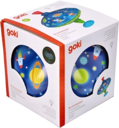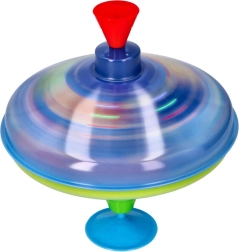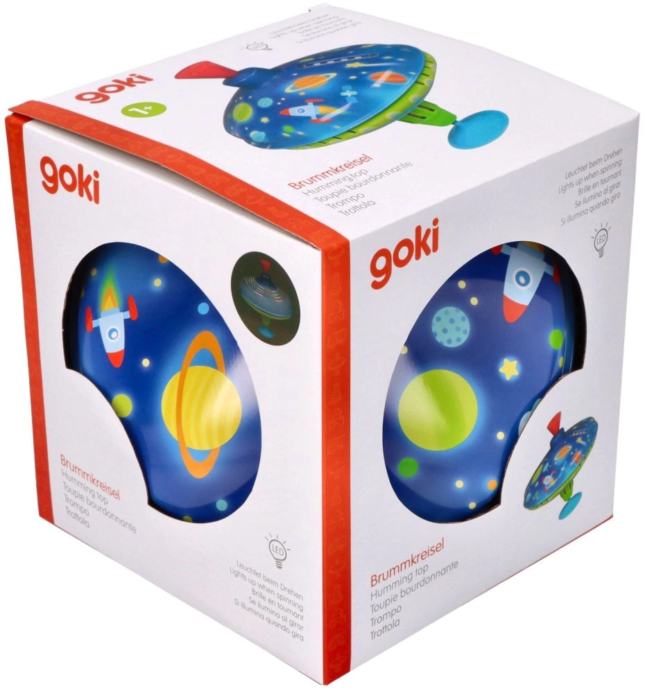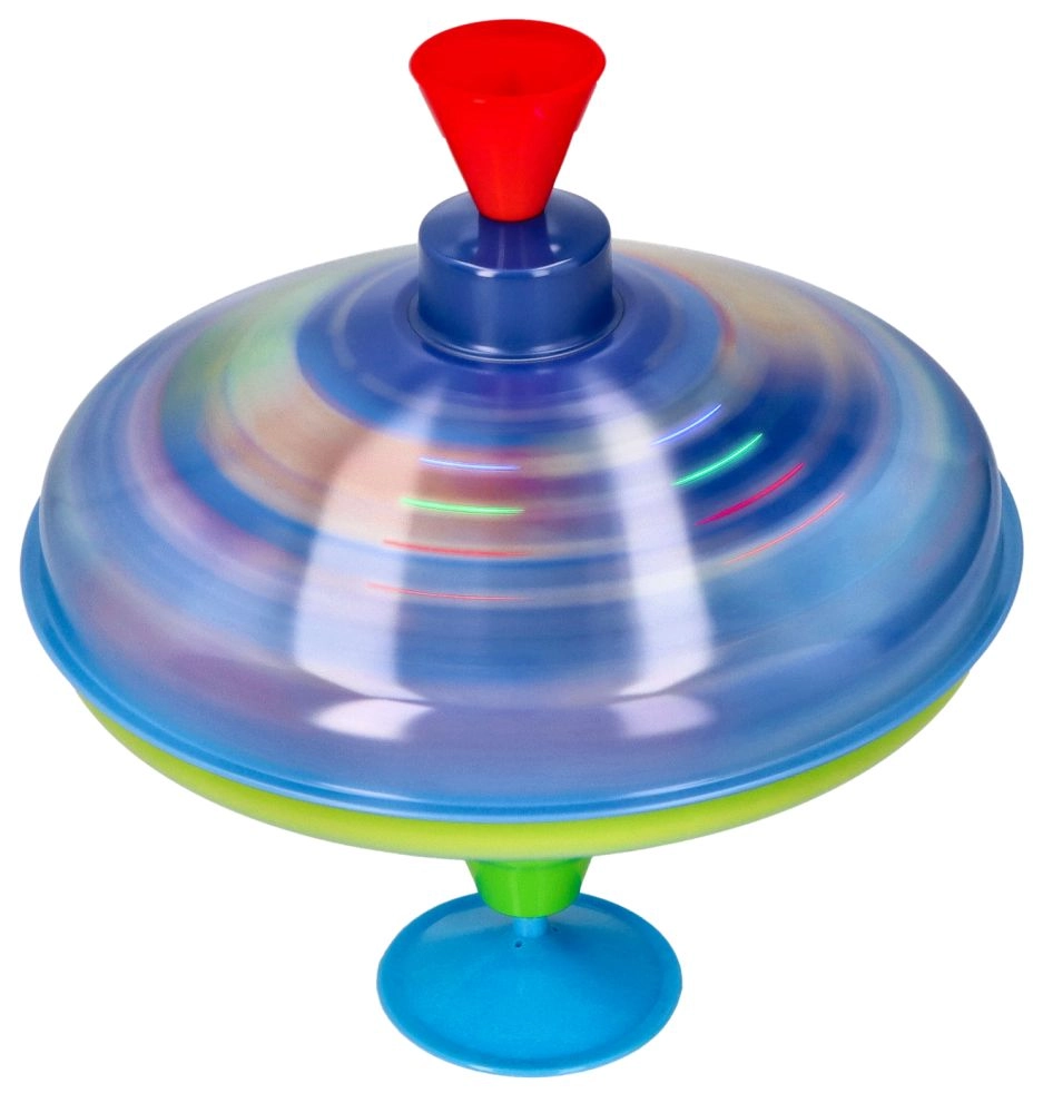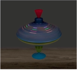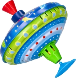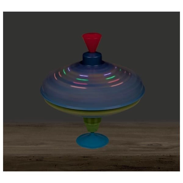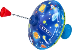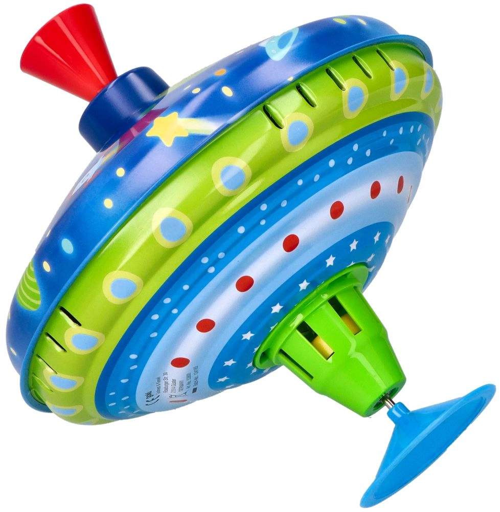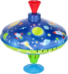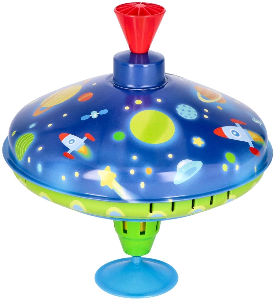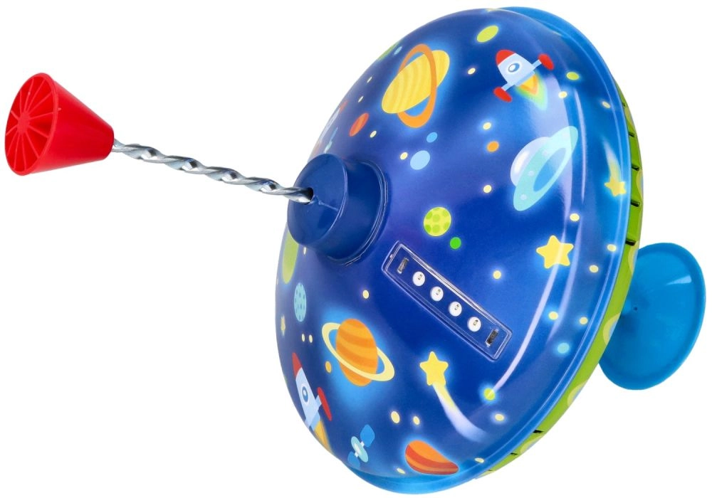 Този цветен метален пумпал с космически мотиви впечатлява от пръв поглед. Благодарение на интегрираната подложка стои стабилно на място, което го прави подходящ и за най-малките деца. С просто натискане на горната дръжка пумпалът се завърта, LED светлините светват и издава характерен, но приятен звук, който подчертава радостта от играта.