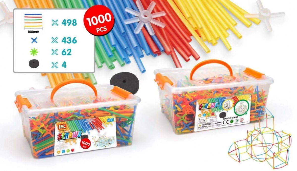Конструкторът Малките Гении с малки сламки позволява на децата да създават различни форми с помощта на цветни свързващи пръчици и кръстовидни конектори.
