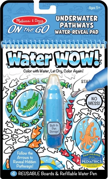 Интерактивната водна книжка за оцветяване от серията On the Go носи на децата часове творческо забавление. Многократно пълнимият воден флумастер разкрива по страниците подводния свят, задачи и лабиринти, които след изсъхване отново изчезват – и оцветяването може да започне наново.