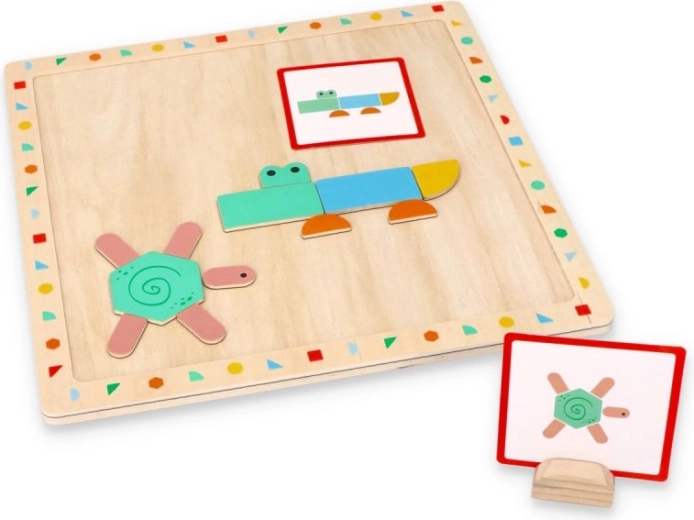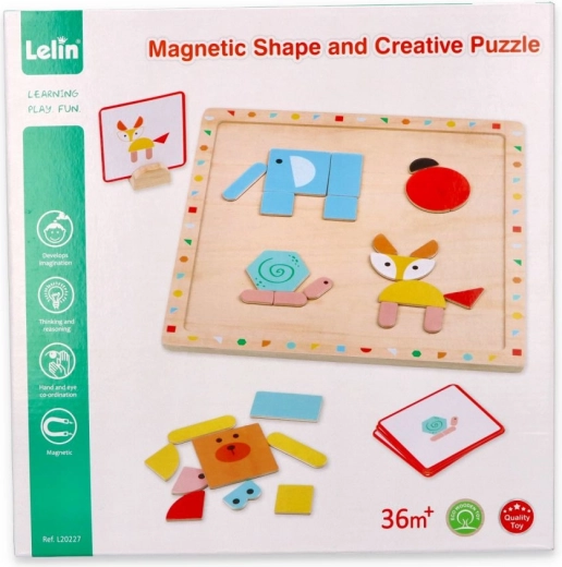 Този магнитен пъзел комбинира цветни геометрични форми и карти с образци, за да могат децата да създават животни, предмети и собствени картинки. Дървената дъска с отвор за картата държи образеца на място, така че децата да се съсредоточат по-лесно върху подреждането и да развиват въображението си.