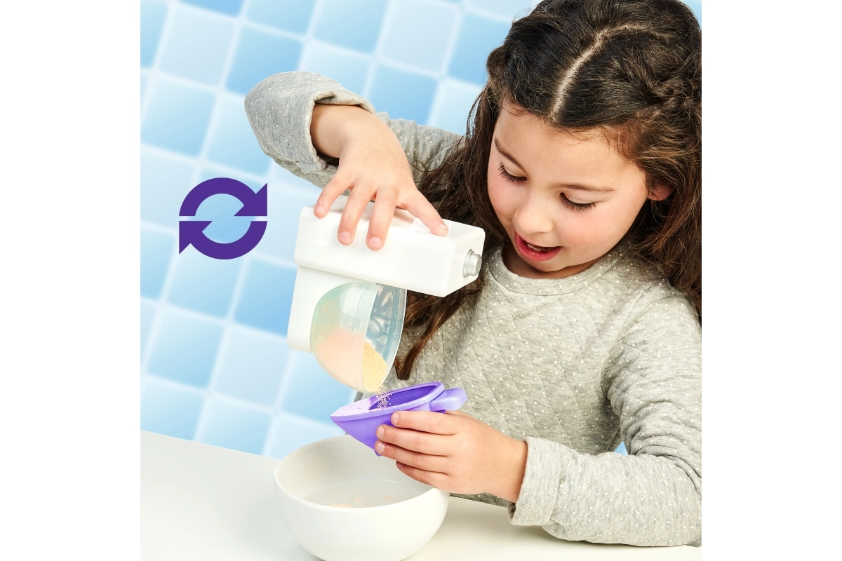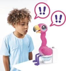 Запознайте се с розовото фламинго, което ще разсмее всяко дете. Обожава да бъде хранено със специалния пясък Aqua, след което трябва бързо да „отскочи“ – това забавно „акане“ е безопасно, а пясъкът може да се използва повторно. Освен това фламингото обича да си бъбри, повтаря това, което чува, и показва пеене и танц.