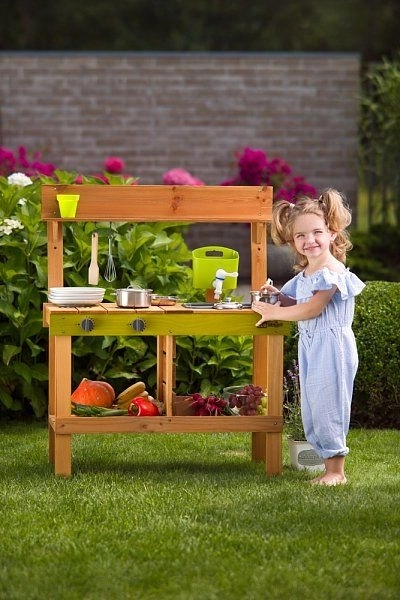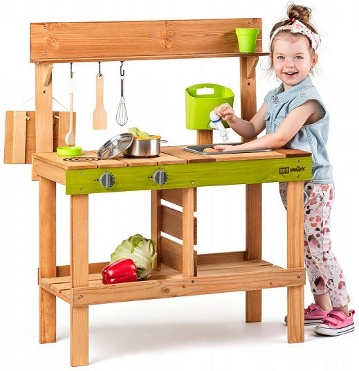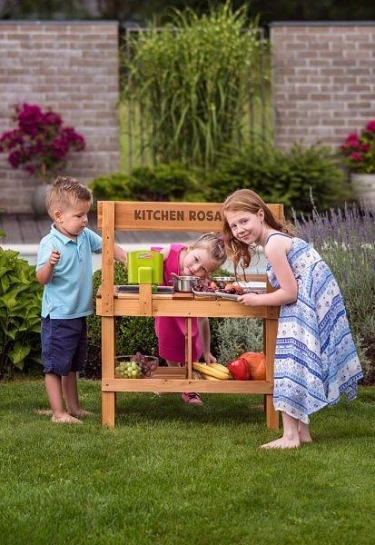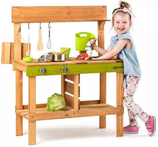 Благодарение на ярките зелени акценти кухнята чудесно се вписва в градината и насърчава сетивната игра с вода, пръст и листа. Подходяща е за деца от 3 години и помага за развитие на фантазията, ролева игра и социални умения.