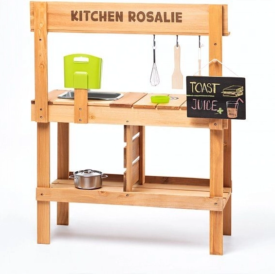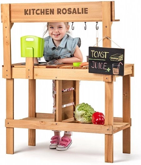Дървената кухня Rosalie предлага на децата реалистично пространство за игра на готвене – от разбъркване и миене в пластмасовата мивка до сервиране на работния плот. Издръжливата комбинация от дърво и пластмаса е подходяща за външна употреба, докато куките и рафтчетата държат всички съдове и „съставки“ подредени и под ръка.