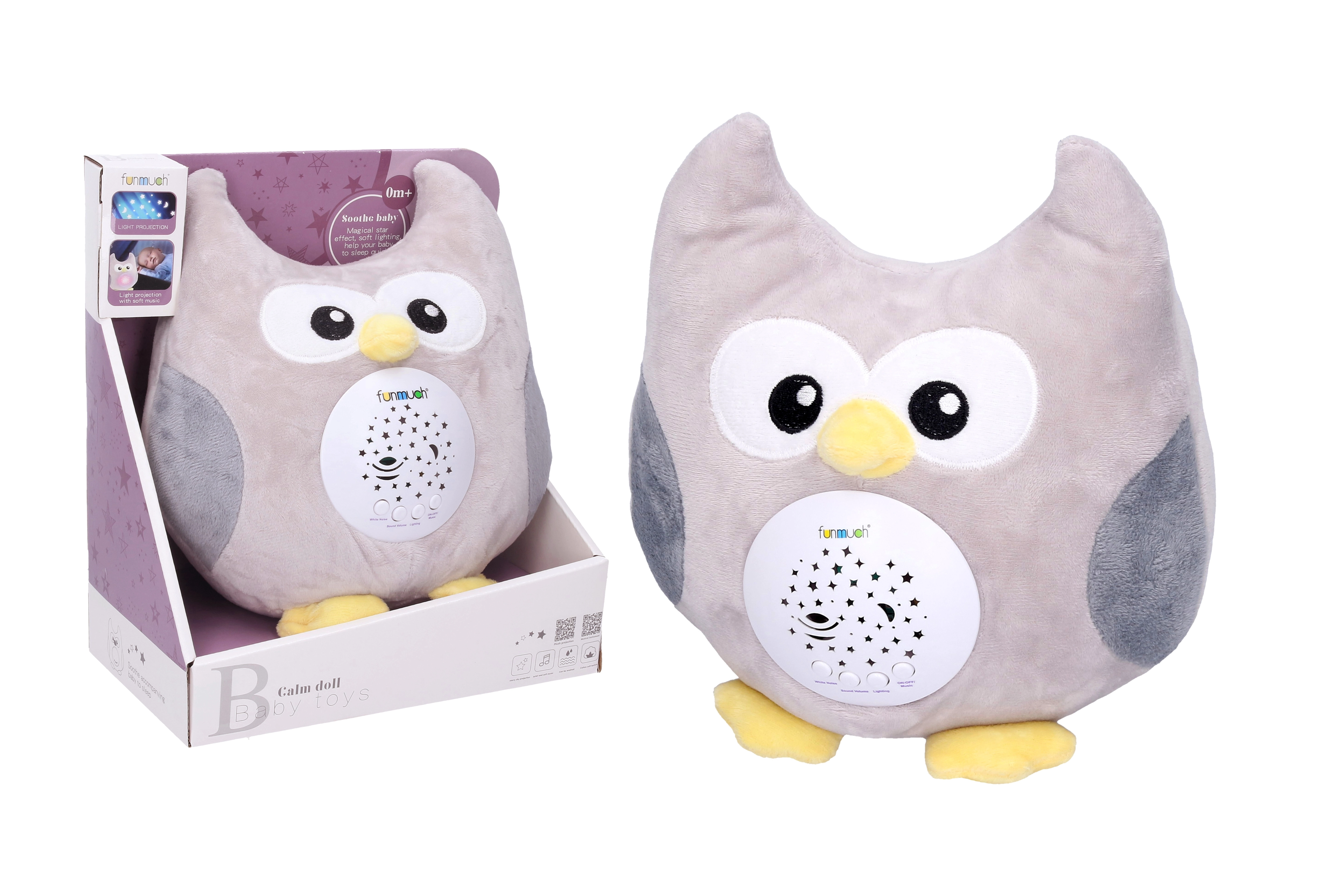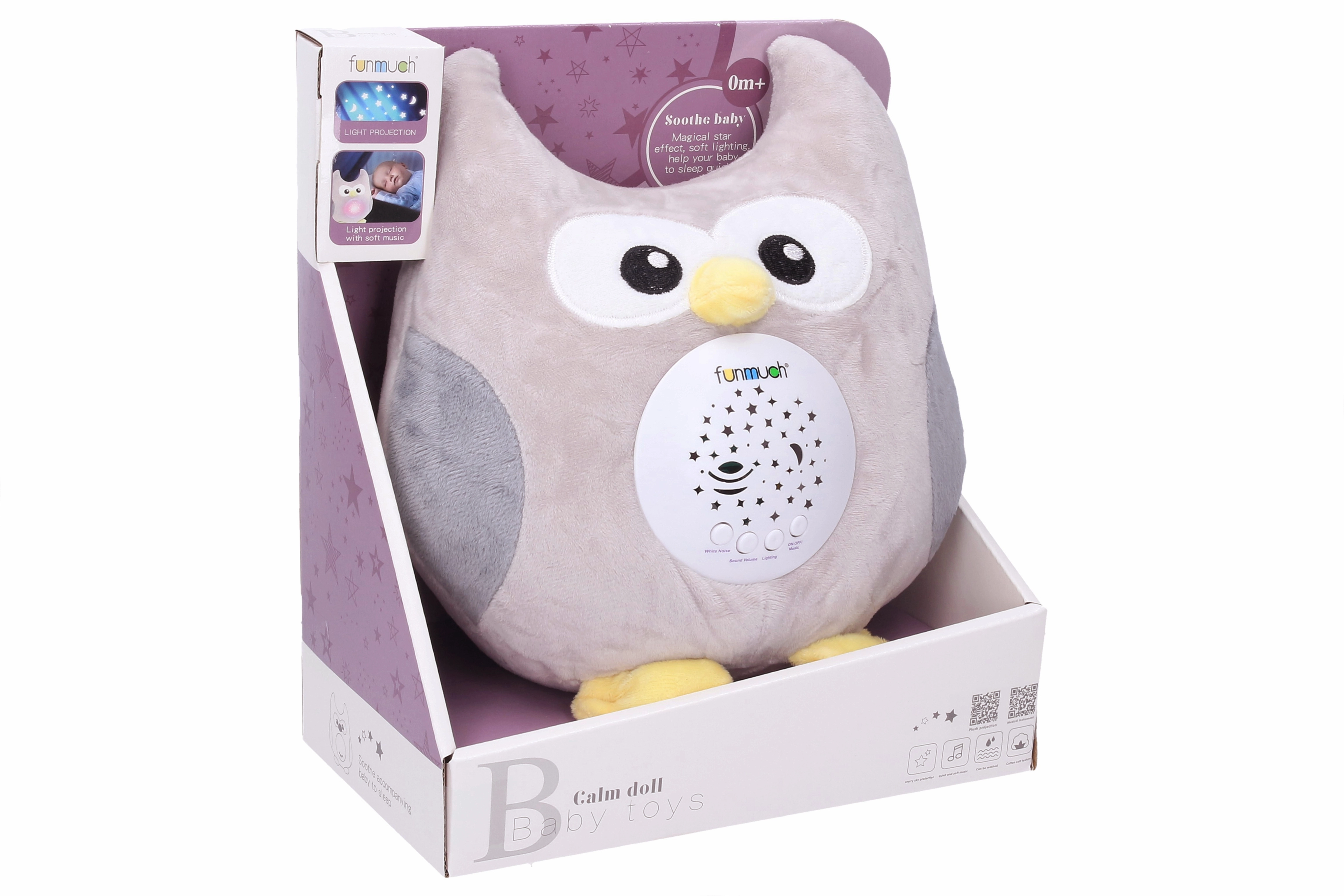 Очарователна нощна лампа във форма на бухалче помага на вашето бебе да заспива спокойно благодарение на приятни мелодии, успокояващ шум и прожекция на звездно небе върху тавана или стените. Идеална от раждането за създаване на уютна атмосфера преди сън.