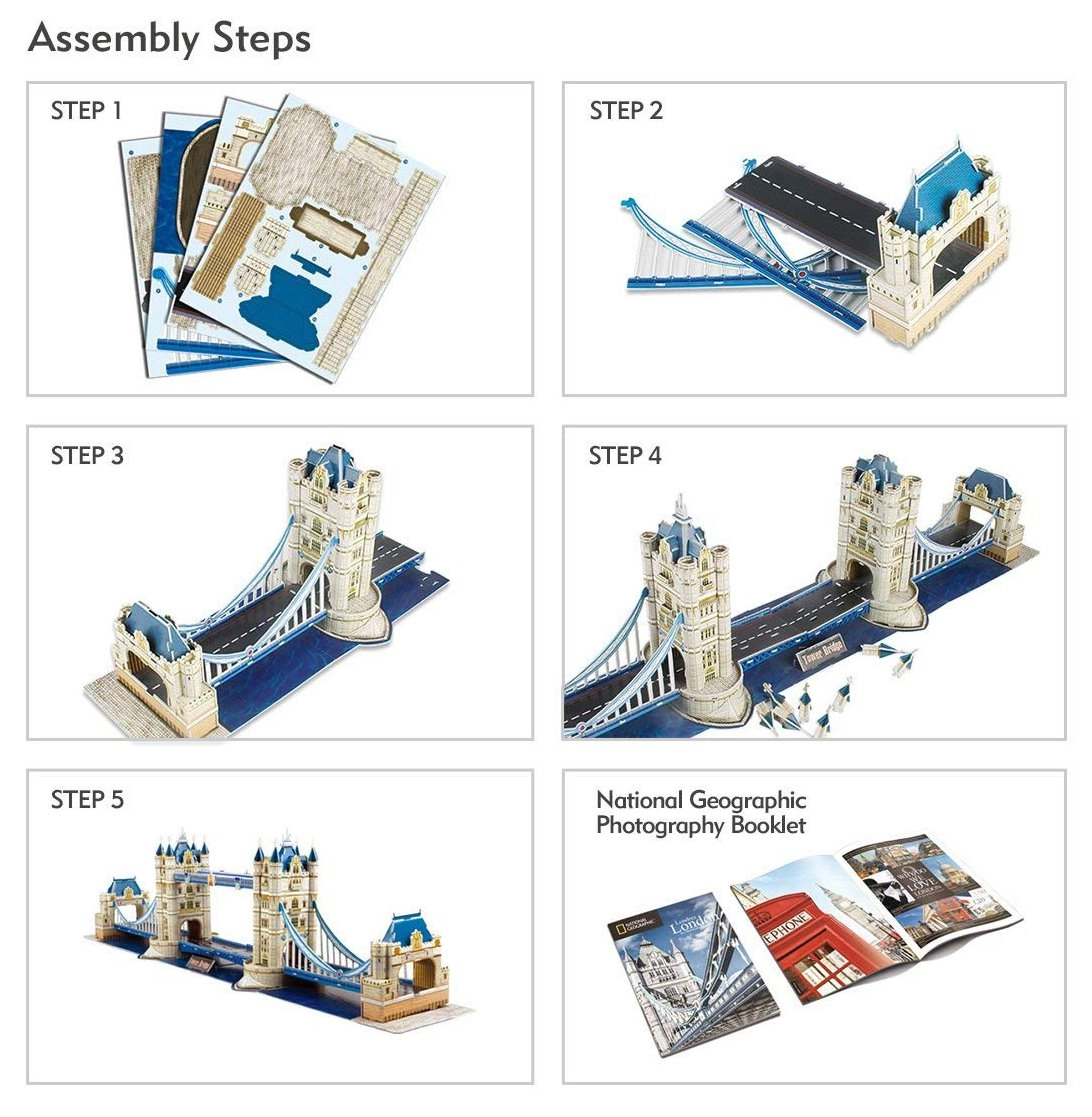 Сглобете емблематичния лондонски мост с реалистичен 3D модел на Тауър Бридж. Комплектът съдържа 120 части от висококачествена пяна с ламинирана печатна хартия, които се сглобяват без лепило и ножици. Насладете се на забавно семейно творчество и създайте декоративен модел с подвижна повдигаща се част и допълнителен пътеводител за Лондон (EN).