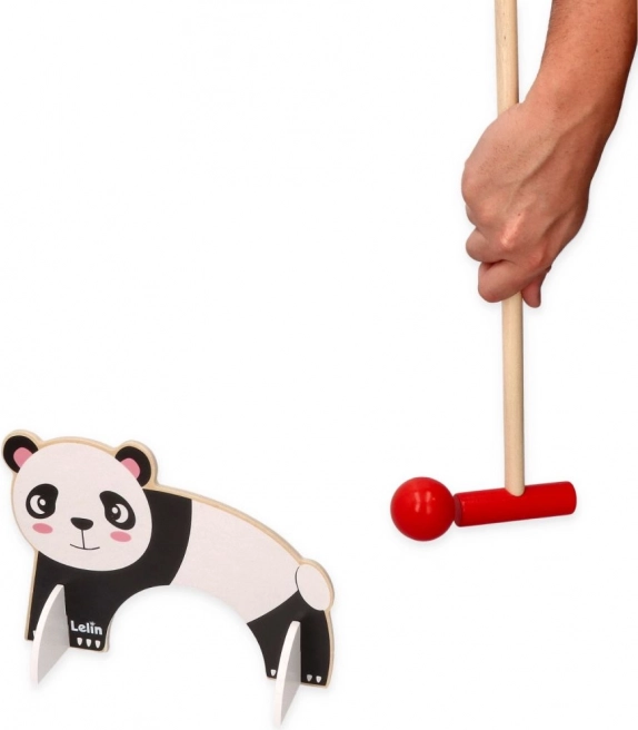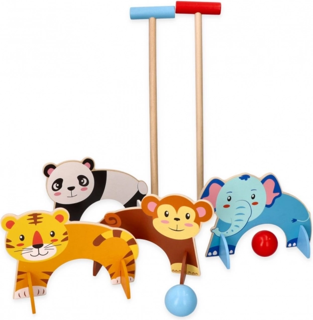 Този дървен комплект за крокет е идеален за малки деца, които искат да се наслаждават на игри на открито. Играта включва цветни палки и топки, като всяка вратичка има свой животински мотив, което създава интерактивно и въображаемо игрово изживяване.