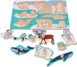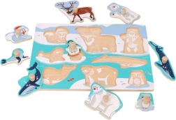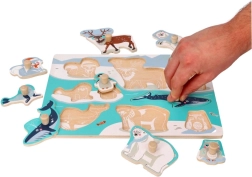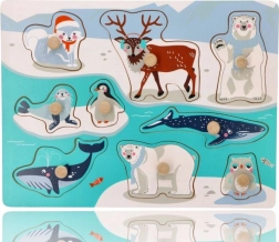Открийте забавния и образователен дървен пъзел с дръжки с мотив на арктически животни. Благодарение на големите дървени копчета частите се хващат лесно дори от най-малките деца, като развиват фината моторика, координацията око–ръка и познаването на животните. Идеален първи пъзел за деца от 12 месеца.