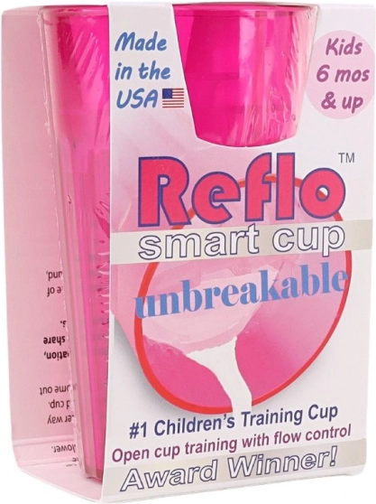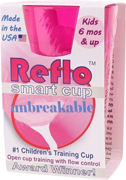 Розовата тренировъчна чаша Reflo помага на децата от 6 месеца безопасно да усвоят пиенето от открита чаша. Благодарение на контрола на потока намалява разливането, нечупливата изработка е идеална у дома и при пътуване, а компактният обем 170 ml е удобен за детска ръка. Произведено в САЩ, отговаря на EN 14350.