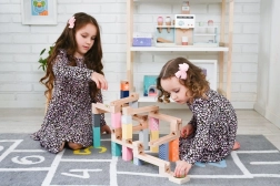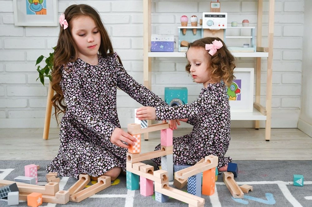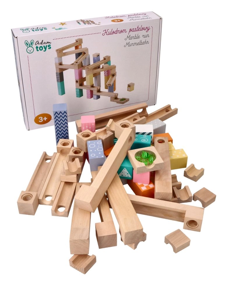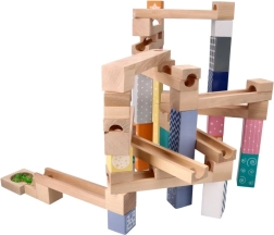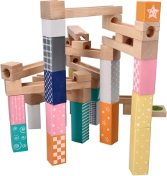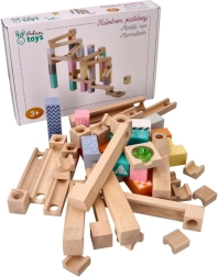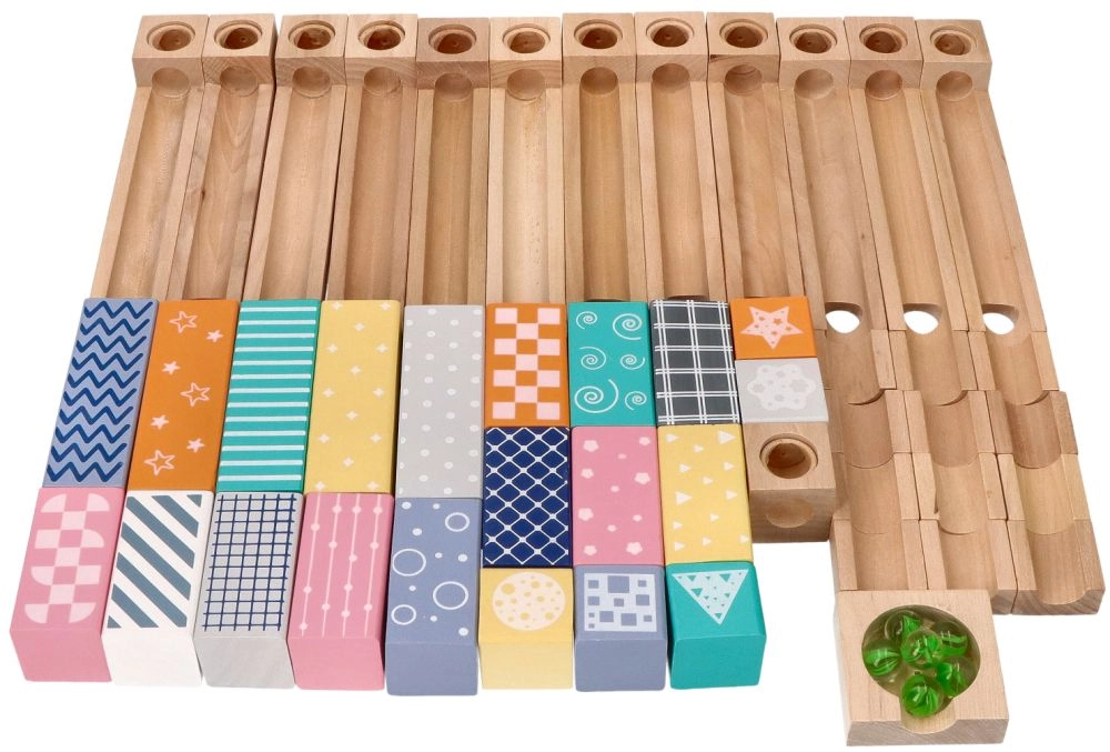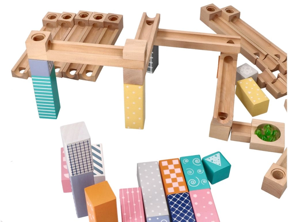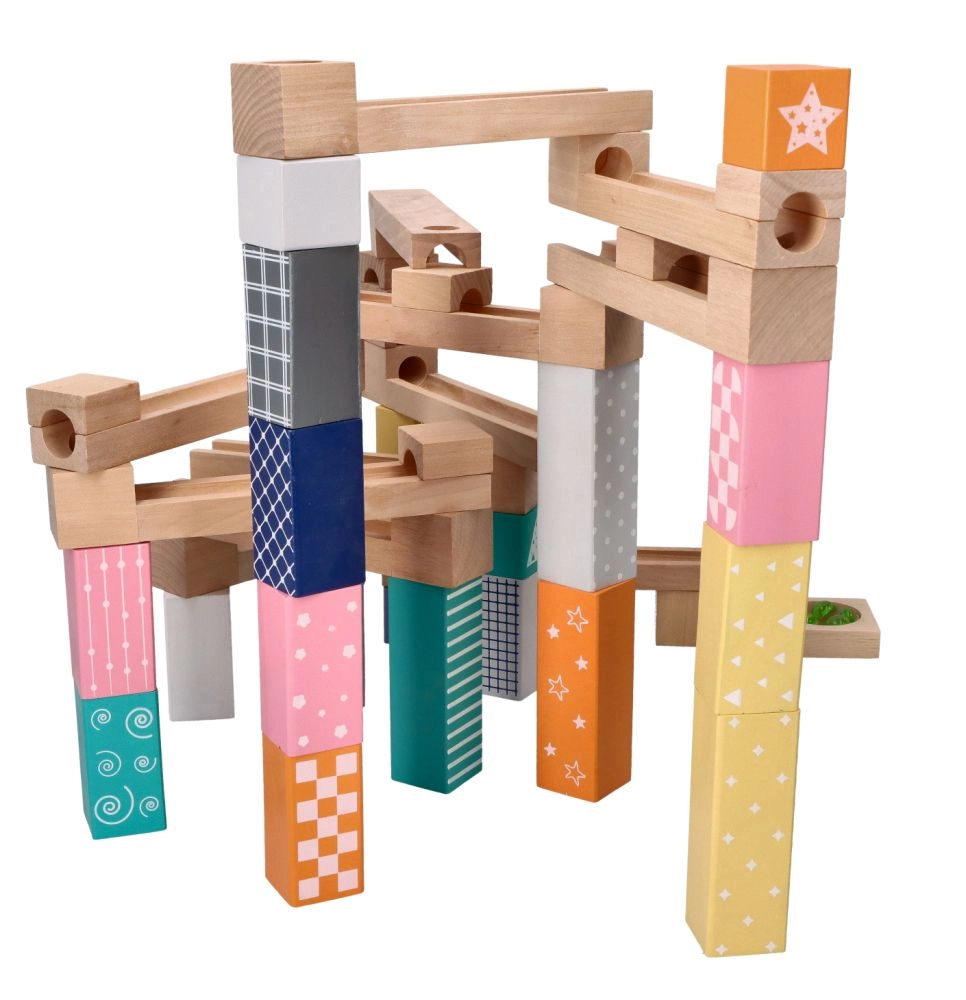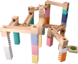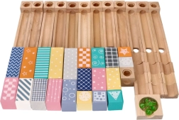 Този висококачествен дървен лабиринт за топчета в нежни пастелни цветове позволява на децата да строят оригинални писти и да наблюдават как топчетата се плъзгат по улеи, мостове и отвори. Издръжливите дървени кубчета с принтирани мотиви осигуряват стабилност и визуална привлекателност и развиват пространственото въображение.