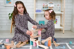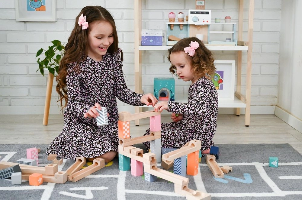 53 добре обмислени дървени елемента позволяват изграждане на прости и сложни писти. Децата експериментират, усъвършенстват дизайните и се учат на принципите на гравитацията и скоростта.