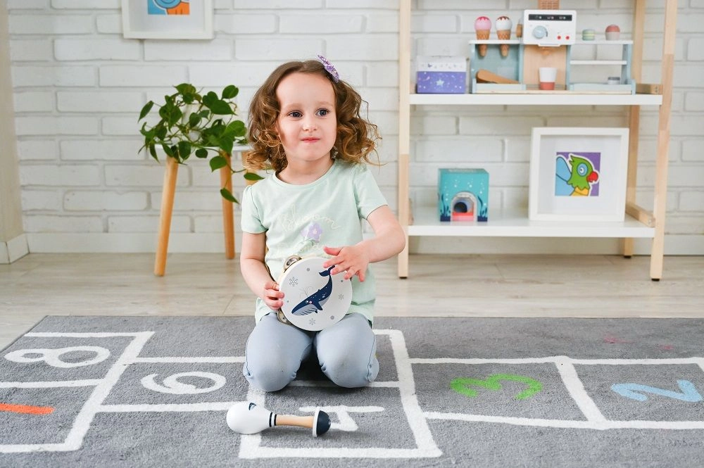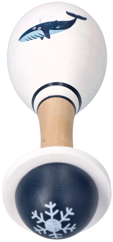 Този стилен детски маракас с мотив на кит е идеален за първи музикални открития. Лекият дизайн се държи лесно и от малки ръчички, а нежният дрънчащ тон подпомага развитието на слуха и ритмичното усещане.