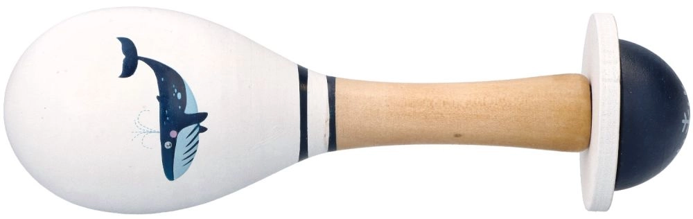 Очарователен дървен маракас с мотив на кит ще зарадва малките музиканти от 5 месеца. Благодарение на удобната дървена дръжка и нежния звук подпомага сетивното развитие, ритъма и моториката. Безопасни бои, подходящи за деца, и прецизна изработка за ежедневна игра.