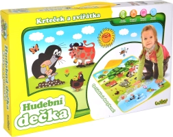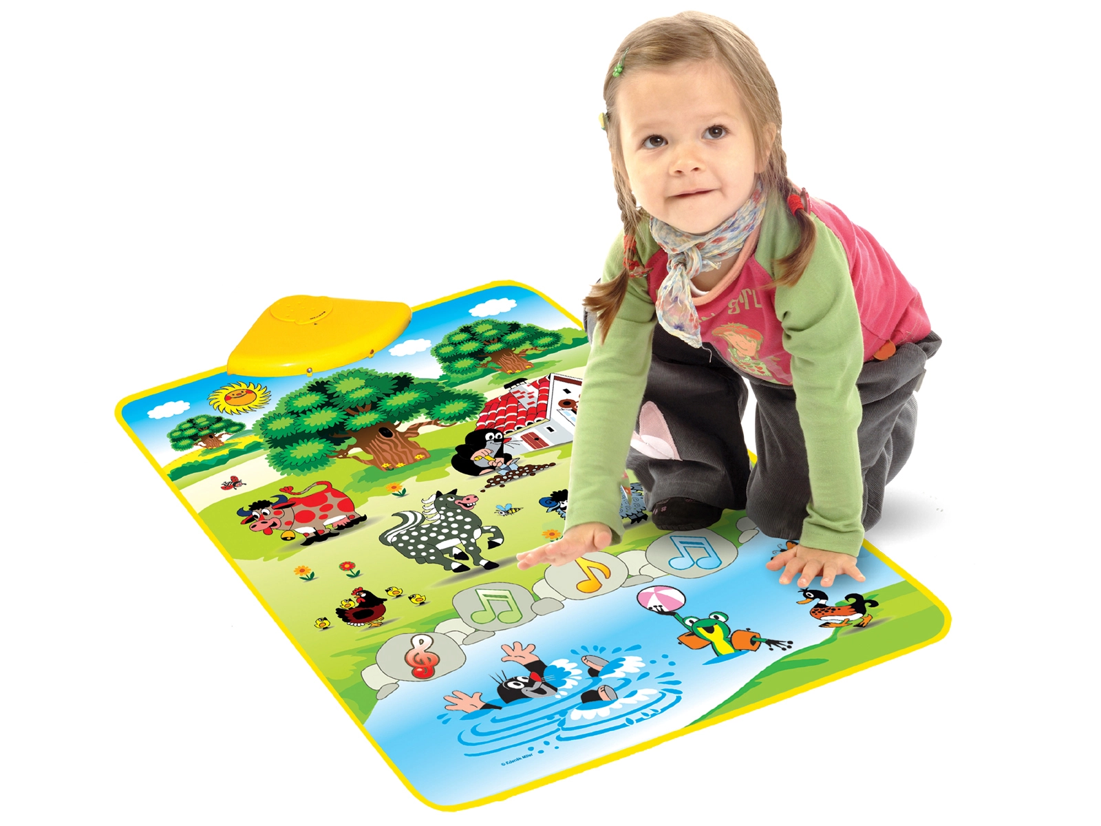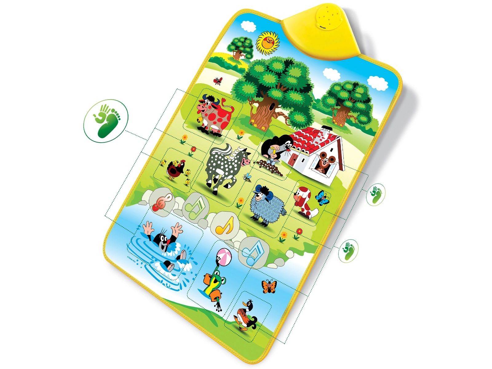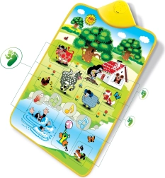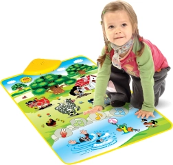 Музикалното килимче на Мики Маус е идеален помощник за развитие на слуховите способности на децата. С Мики в градината те ще се научат да различават звуци като крава, конче, жабче и други. Всичко е разположено на меко килимче, което лесно реагира на докосване: