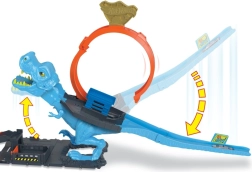 Победи динозавъра и спаси града с игровия сет Hot Wheels City Примка T‑Rex. Включва мощен изстрелвач, 22,5 см примка и трасе, минаващо през устата на синия T‑Rex. При успешен удар очите на T‑Rex се променят от яркожълти на X след нокаут. В комплекта има 1 метална количка 1:64, а сетът може да се свързва с други писти Hot Wheels.
